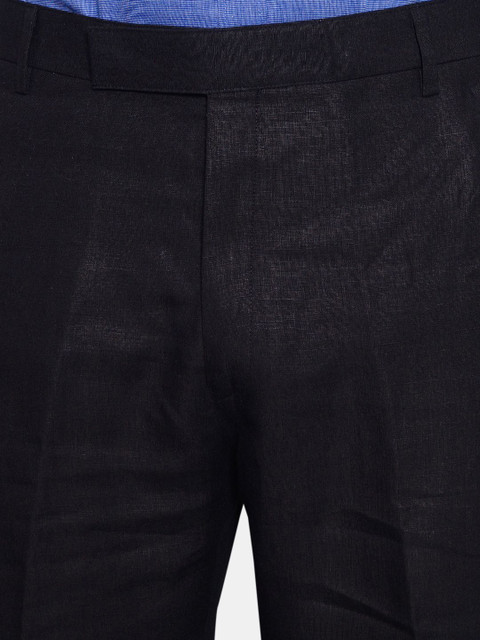 A pair of black solid mid-rise trousers has a belt loops waistband with button and zip fly closure and 4 pockets.