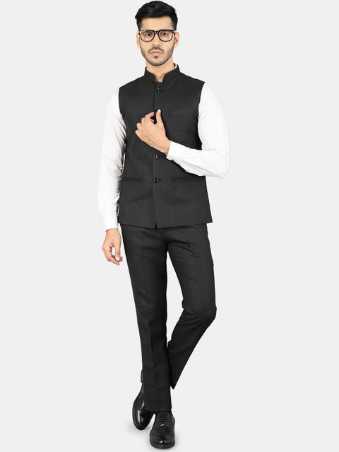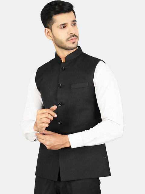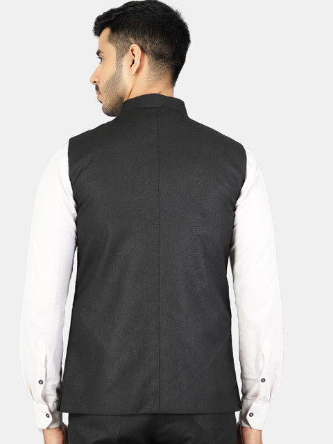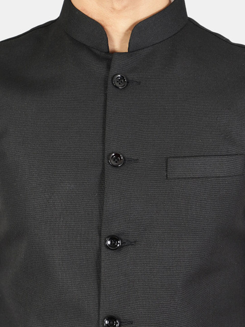 Black solid waistcoat, has a mandarin collar, a button placket, three pockets, and sleeveless