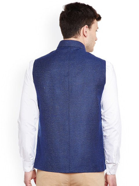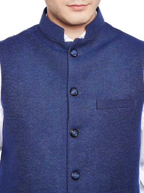 Blue Nehru jacket, has a stand collar with a full button placket, sleeveless, three pockets, an attached lining