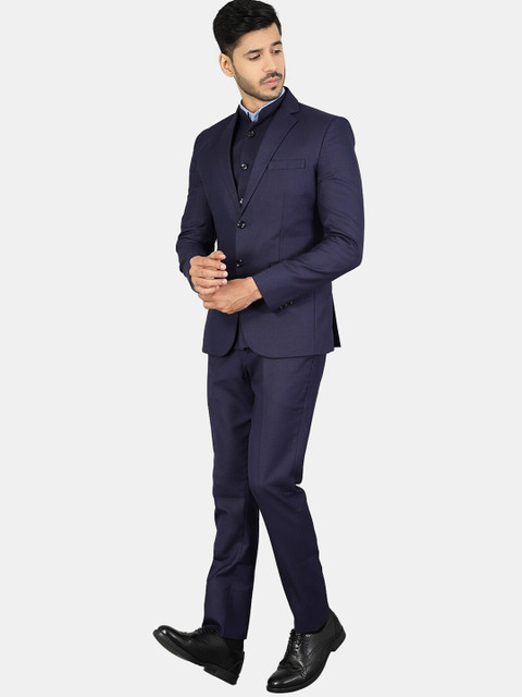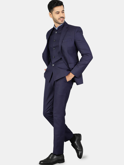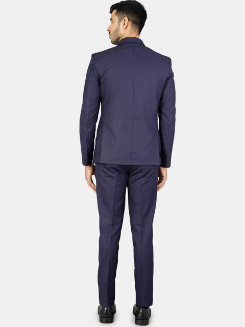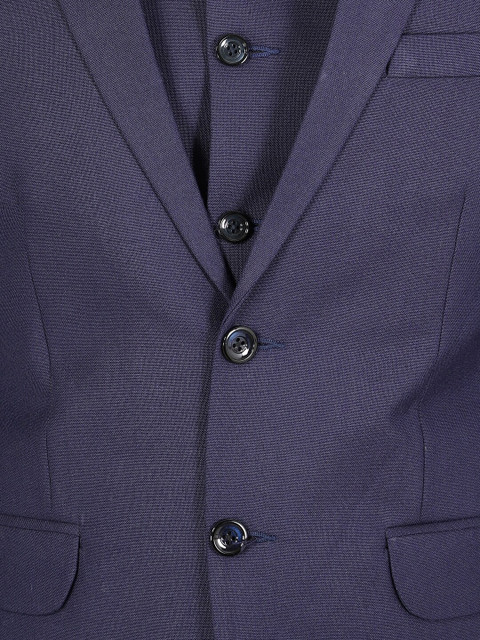 Blue solid formal blazer, has a notched lapel, single-breasted with double button closures, long sleeves, three pockets, and a double-vented back hem.