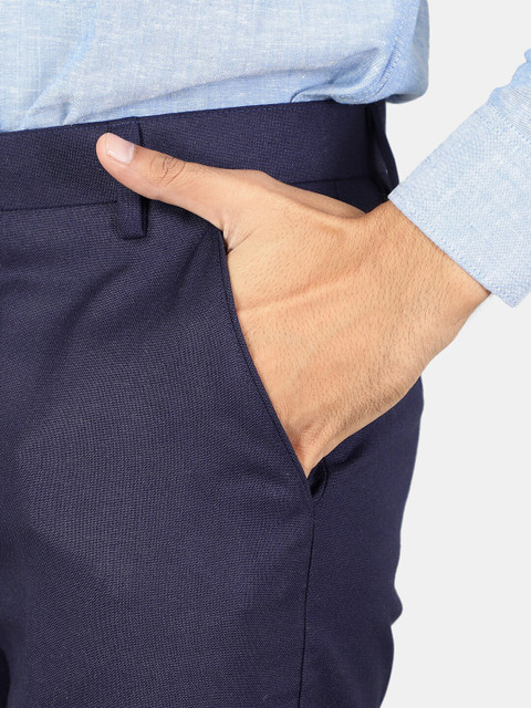Blue solid mid-rise formal trousers, has a waistband with belt loops, zip fly with a button closure