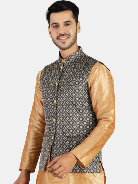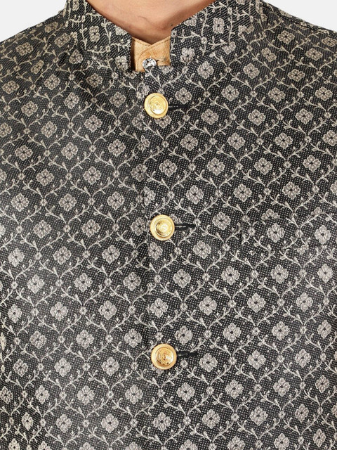 Grey woven design nehru jacket, hasa mandarin collar, a full button placket, sleeveless, three patch pockets