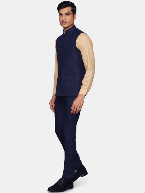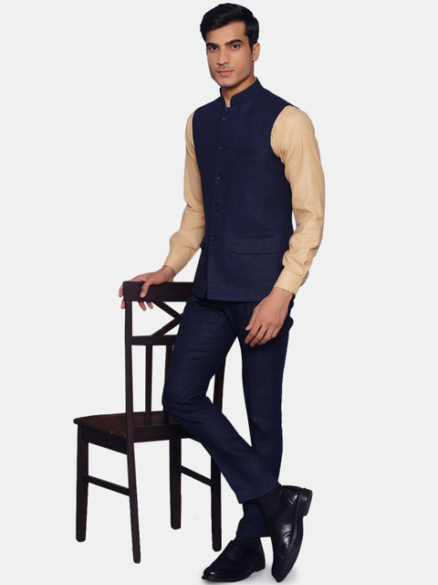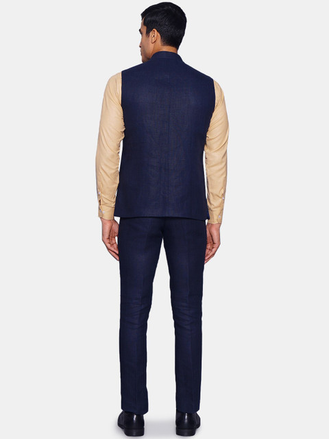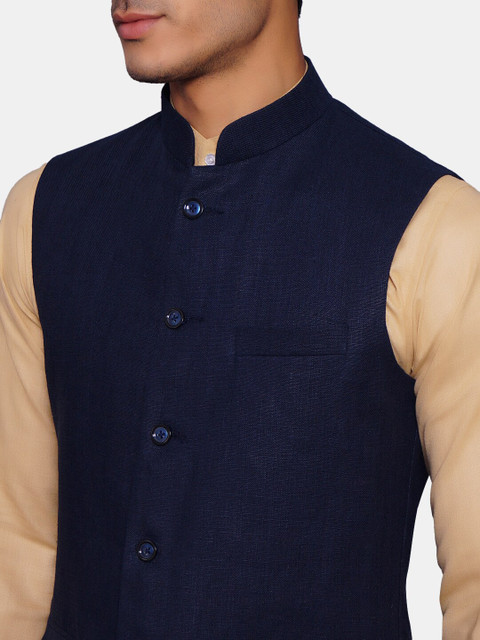 Navy blue solid regular-fit bandhgala jacket, has a mandarin collar, sleeveless, a full button placket, two flap pockets, one welt pocket, an attached lining, and vented sides