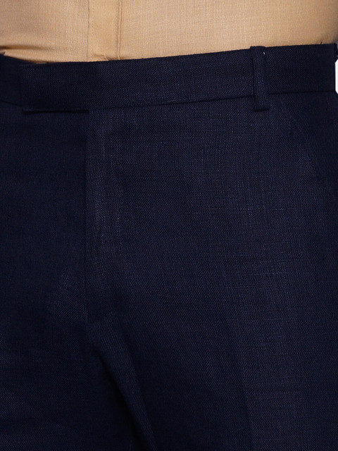 A pair of navy blue solid mid-rise trousers, has a waistband with belt loops, a zip fly and a button closure, and four pockets