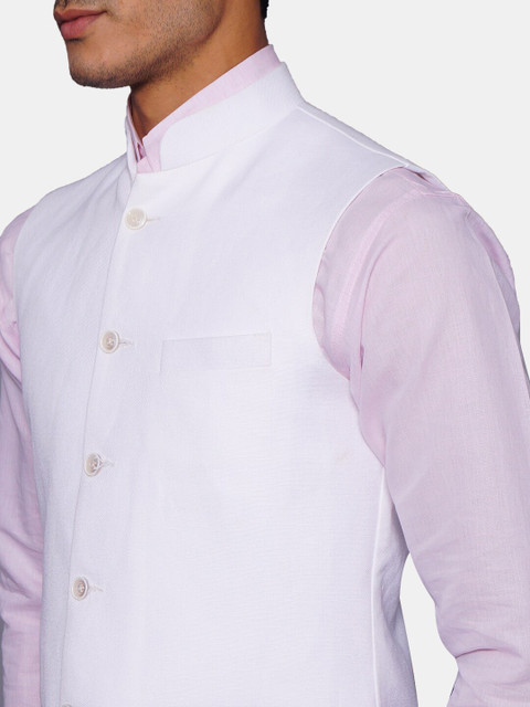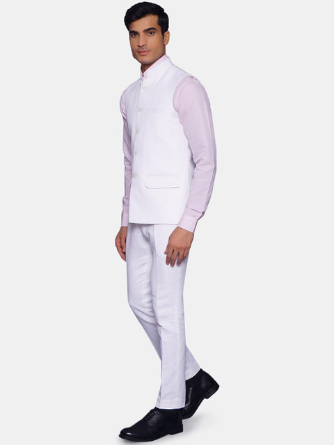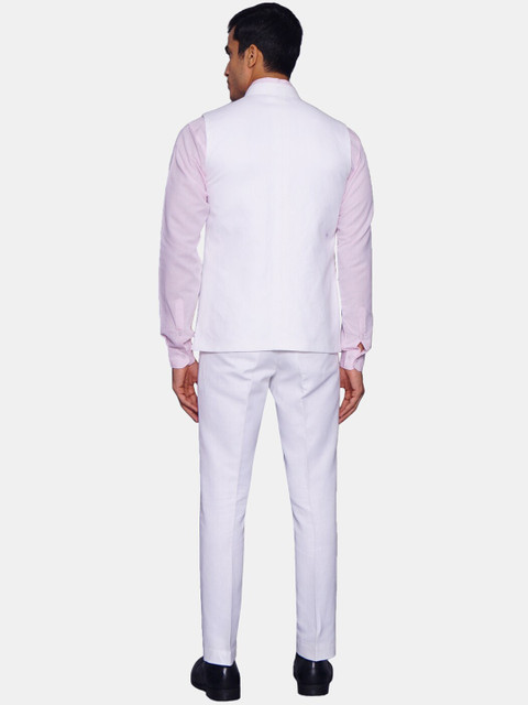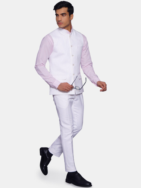 White solid regular-fit bandhgala blazer, has a mandarin collar, long sleeves, a full button placket, one welt pocket, two flap pockets, an attached lining, and vented sides