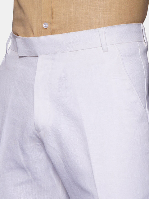 A pair of white solid mid-rise trousers, has a waistband with belt loops, a zip fly and a button closure, and four pockets