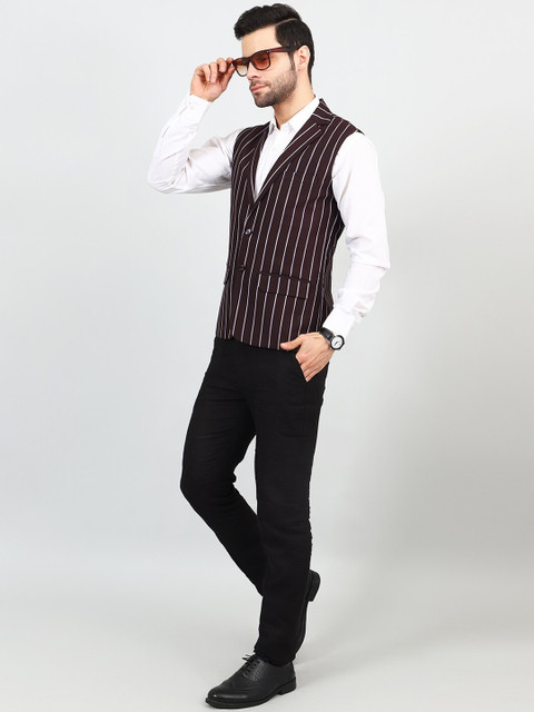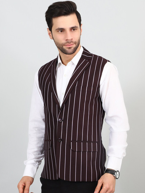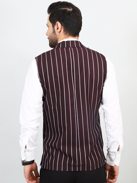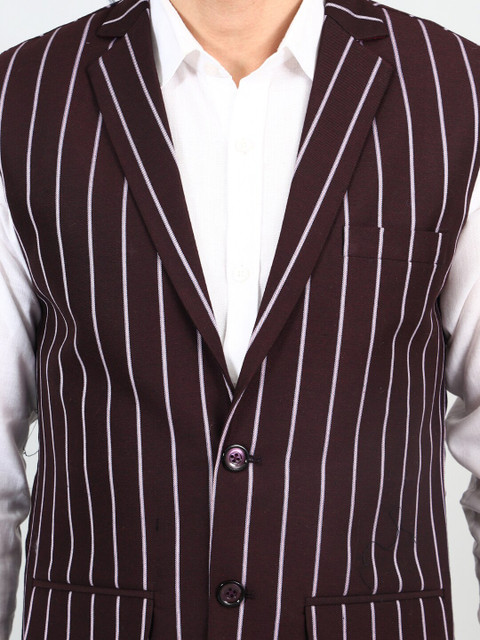 Maroon and white striped woven Nehru jacket, has a Notched lapel collar, a full button placket, sleeveless, three pockets