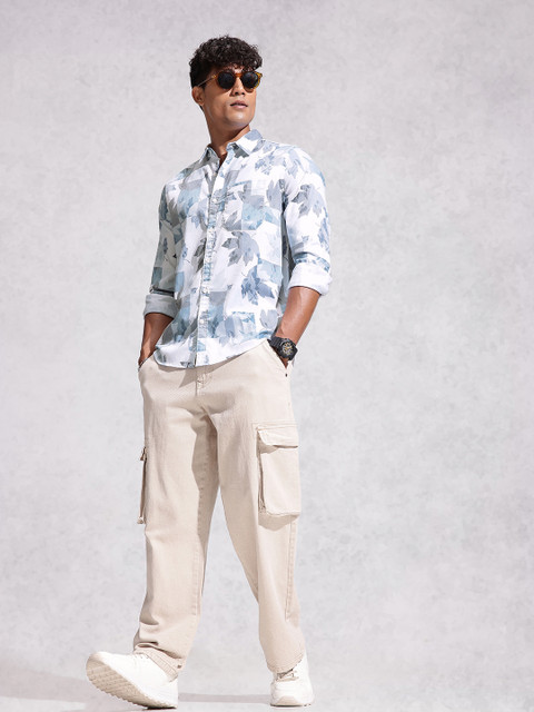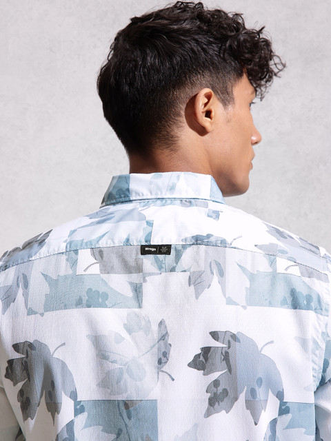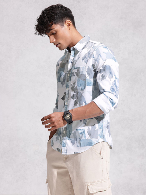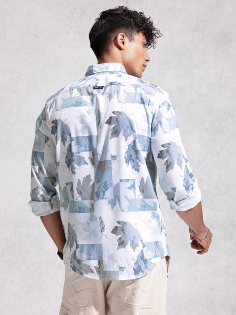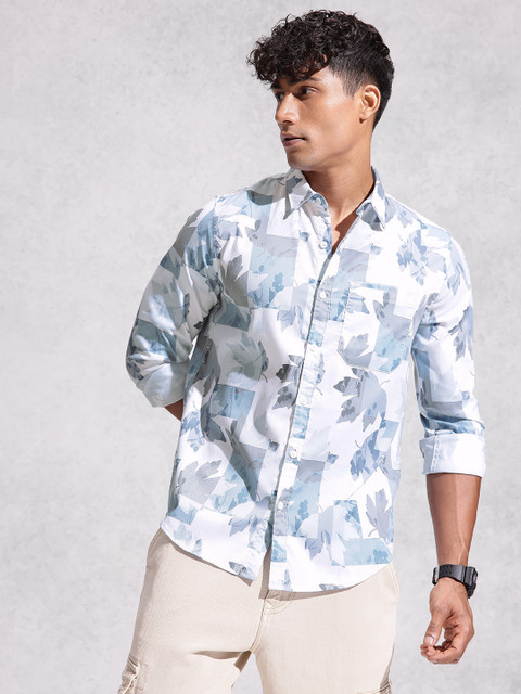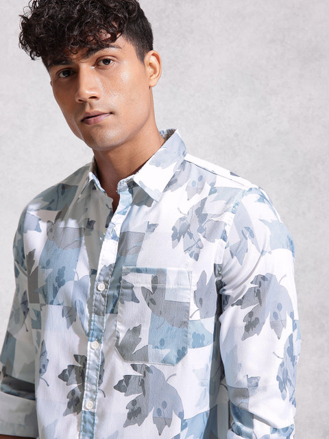 White, grey and blue abstract printed opaque casual shirt, has a spread collar, button placket, 1 patch pocket, long regular sleeves, curved hem.