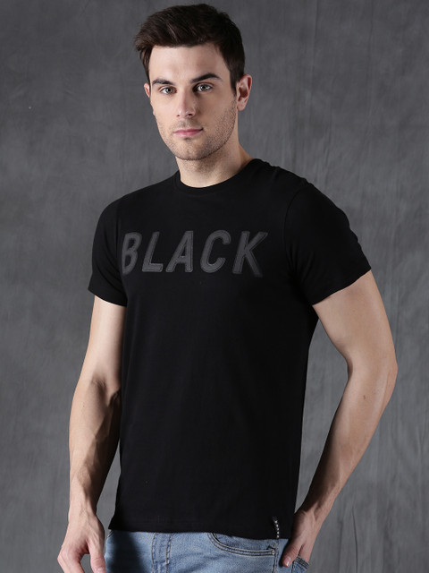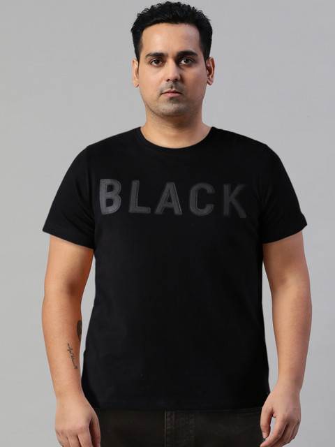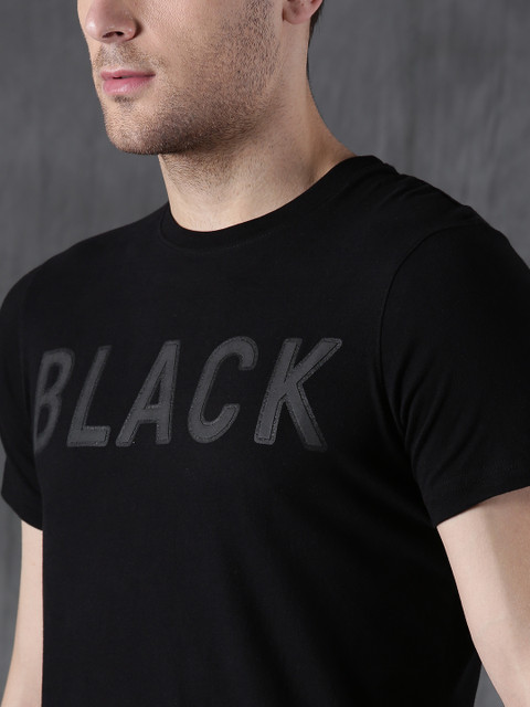 Black solid T-shirt with printed detail, has a round neck, short sleeves