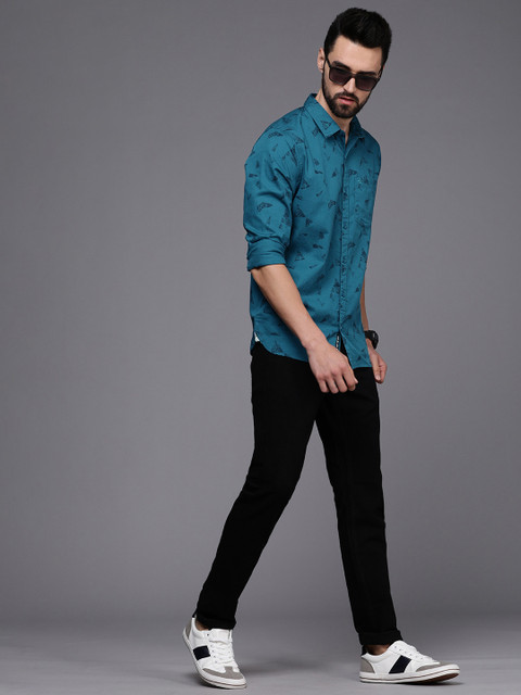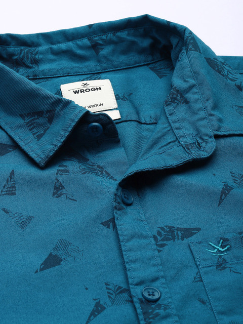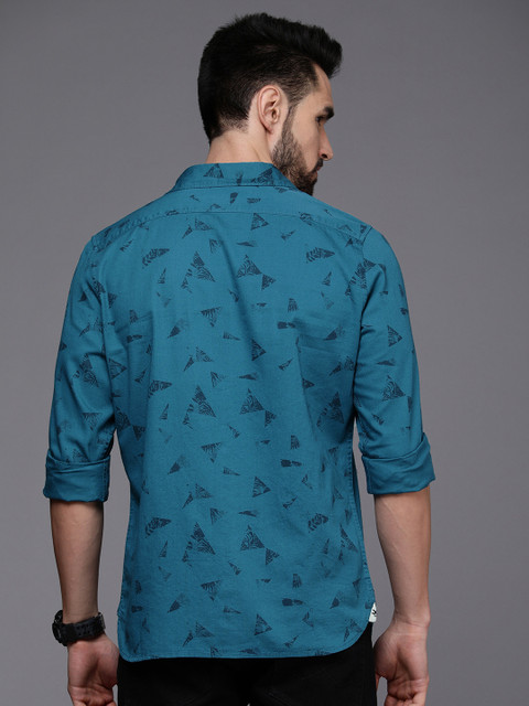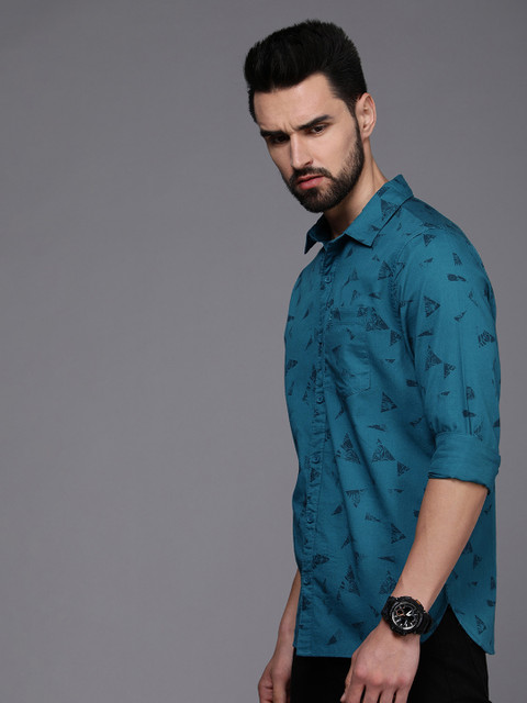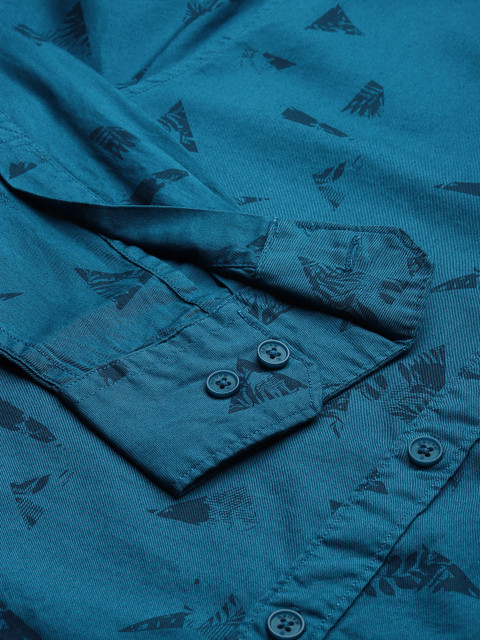 Blue conversational printed opaque Casual shirt ,has a cutaway collar, button placket, 1 patch pocket, long regular sleeves, curved hem