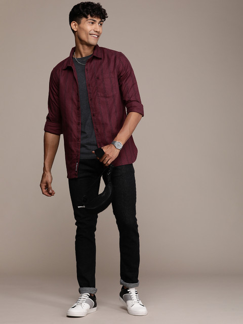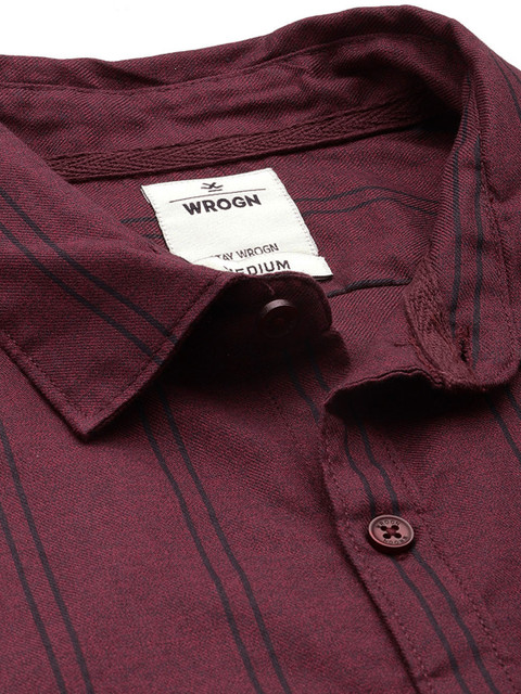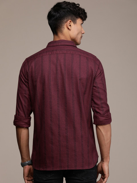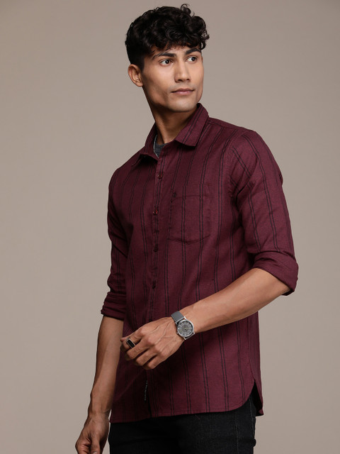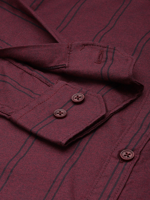 Maroon vertical stripes striped opaque Casual shirt ,has a spread collar, button placket, 1 patch pocket, long regular sleeves, curved hem