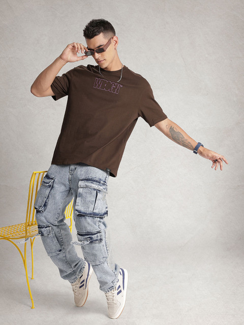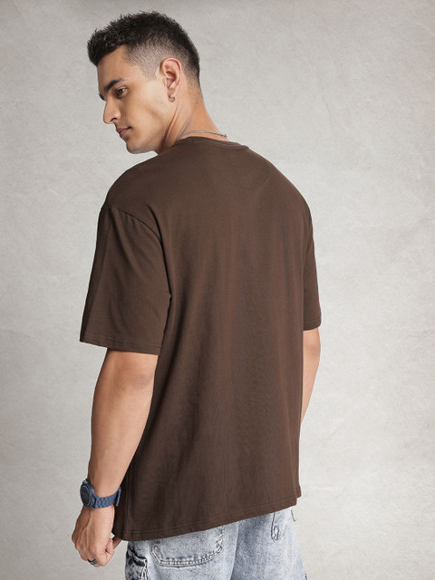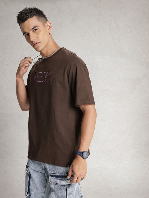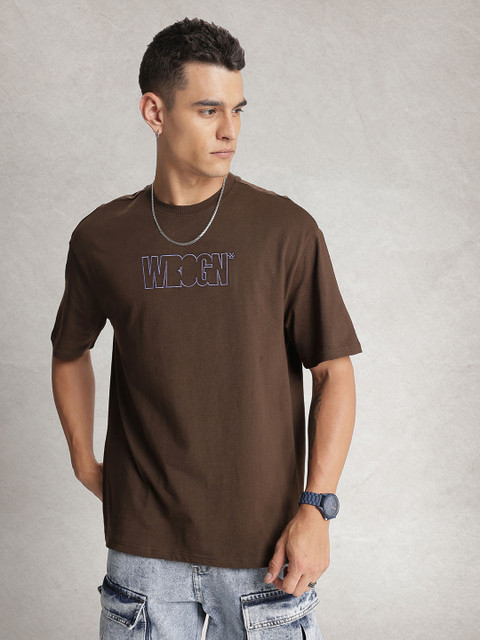 WROGN Pure Cotton Brand Logo Embroidered Drop-Shoulder Sleeves Oversized T-shirt