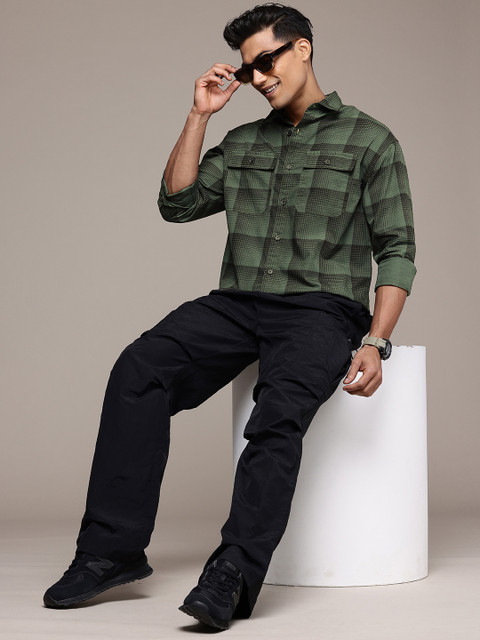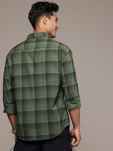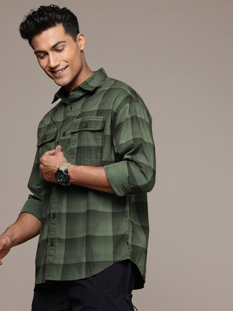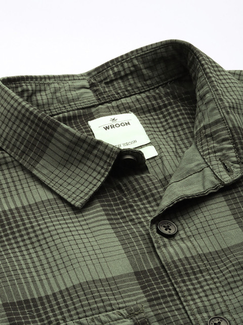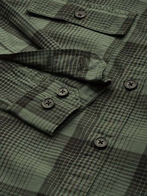 Green other checks opaque casual shirt ,has a spread collar, button placket, 2 flap pocket, long drop-shoulder sleeves, curved hem