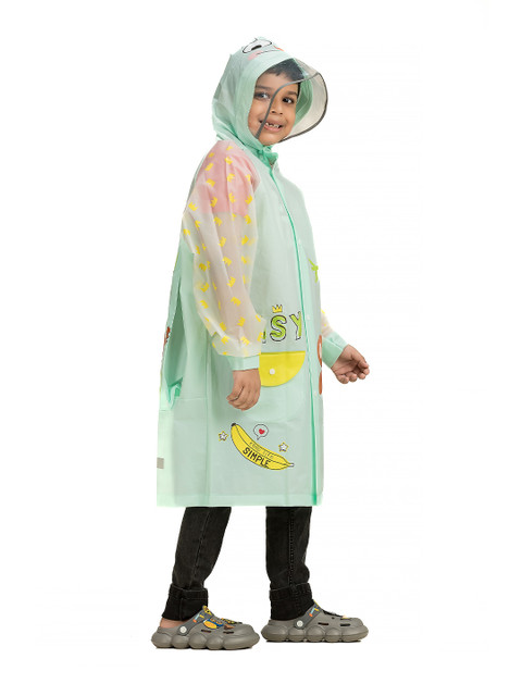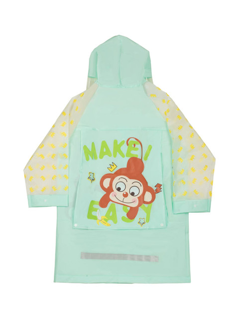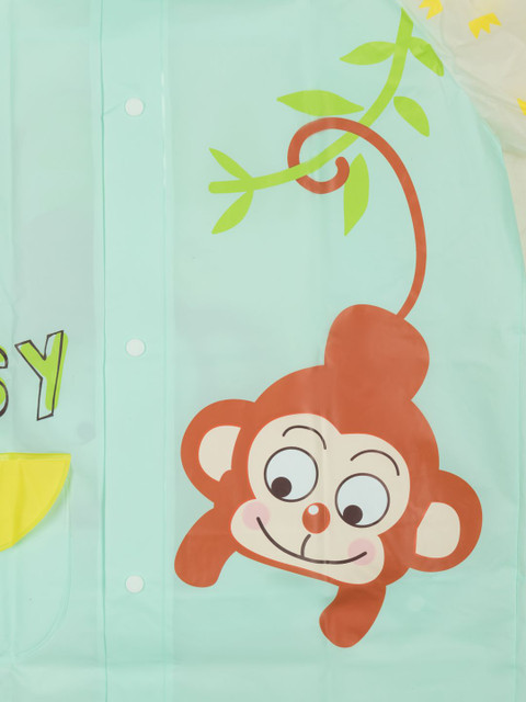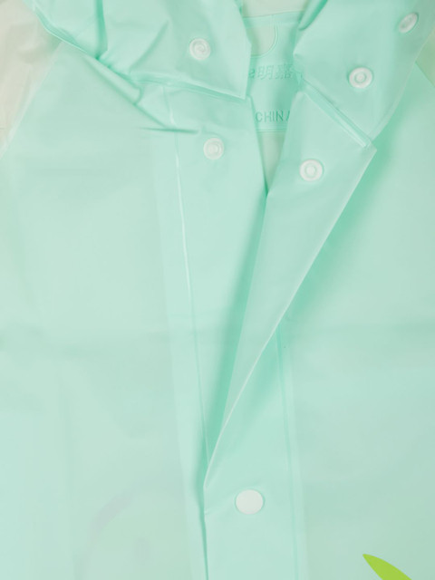 Turquoise blue printed regular-fit hooded rain jacket, has an attached hood with drawcord toggle, seam-sealed with adjustable hems, a full front button placket with flap, cuffs and hood with drawcord, a packable hood and breathable vents at the back, and two flap zipper pockets