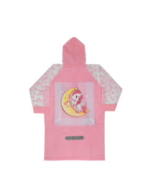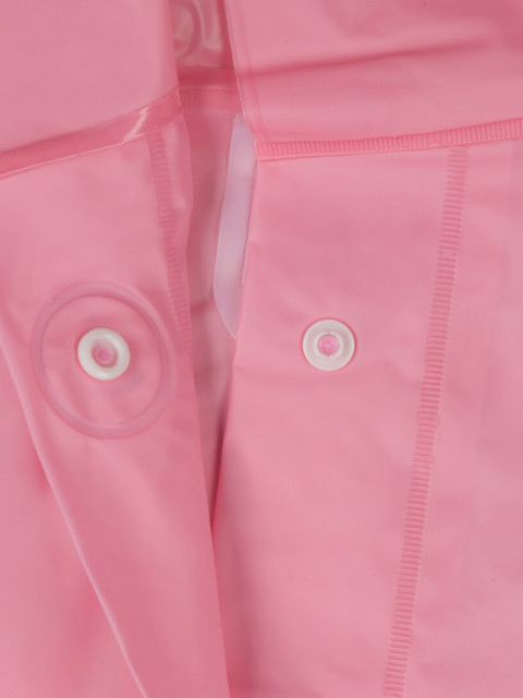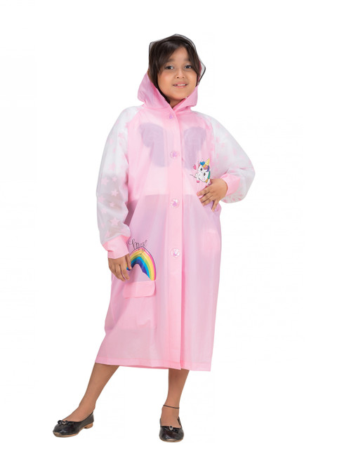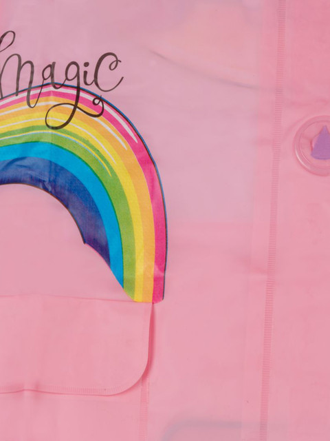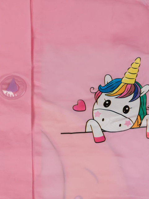 Pink printed rain jacket, has a self-attached hood that comes with a drawstring toggle and cord lock stopper with the front closure using snap buttons and a placket covering the zipper with velcro closure and long sleeves