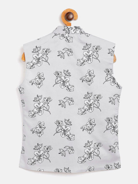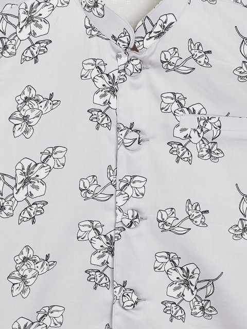 Grey, white and black printed woven Nehru Jacket, has a mandarin collar, sleeveless, a full button placket, one welt pocket, straight hem