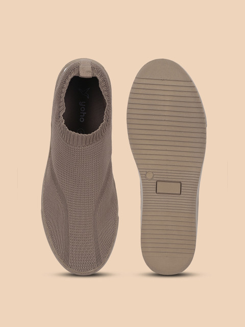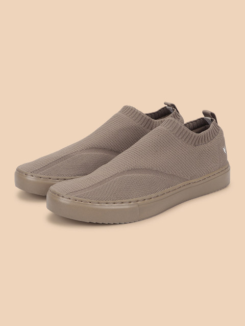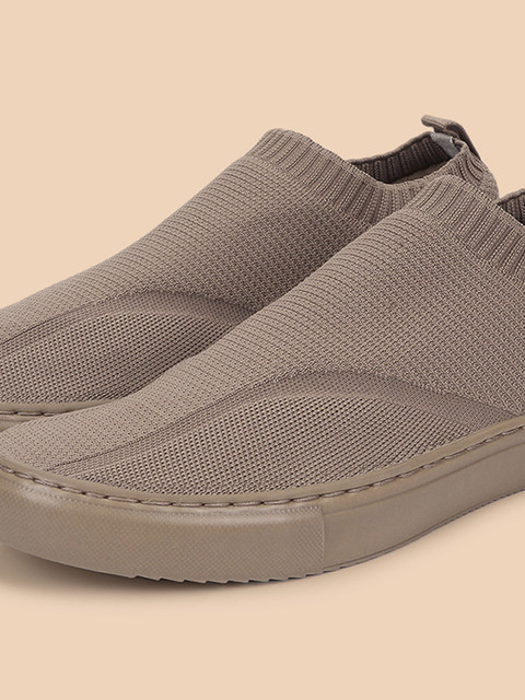 A pair of pointed toe brown slip-on sneakers, has mid-top styling, slip-on detail
