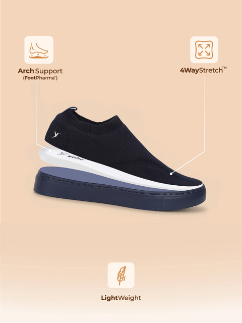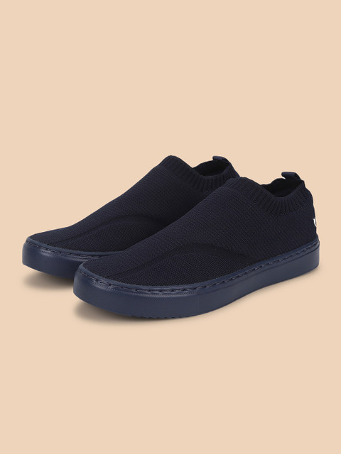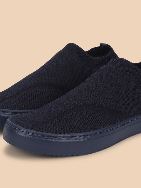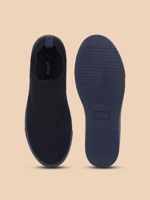 A pair of round toe navy blue core, has mid-top styling, slip-on detail