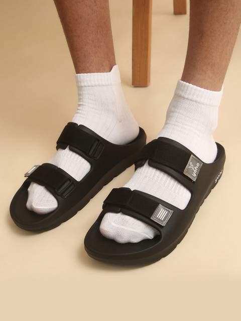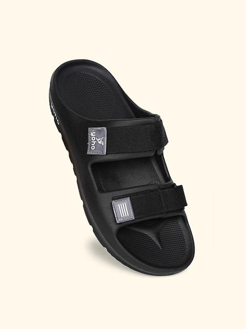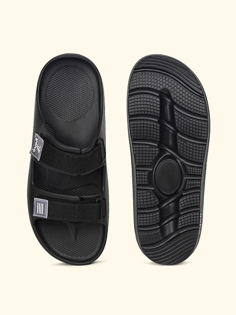 A pair of black comfort sandals