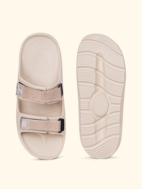 A pair of beige comfort sandals