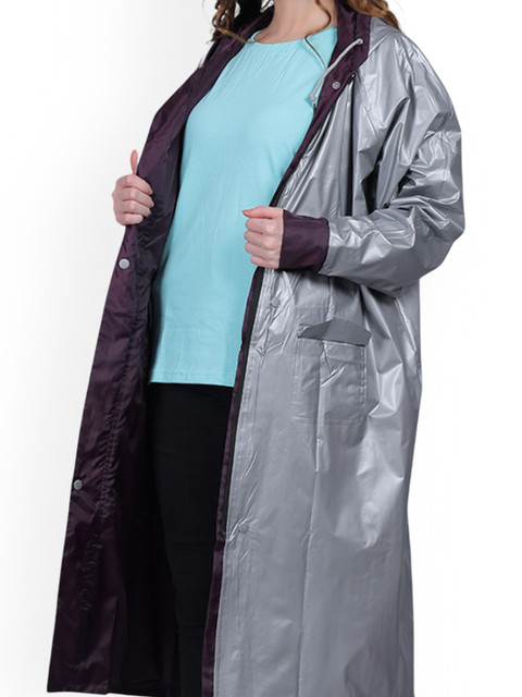 Purple & Grey solid regular-fit hooded rain jacket, has an attached hood with drawcord toggle, seam-sealed with adjustable hems, a full front zipper placket with flap, cuffs and hood with drawcord, a packable hood and breathable vents at the back, and two flap zipper pockets