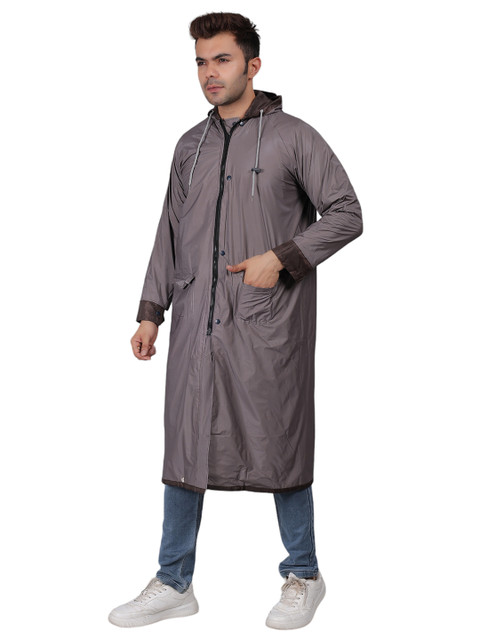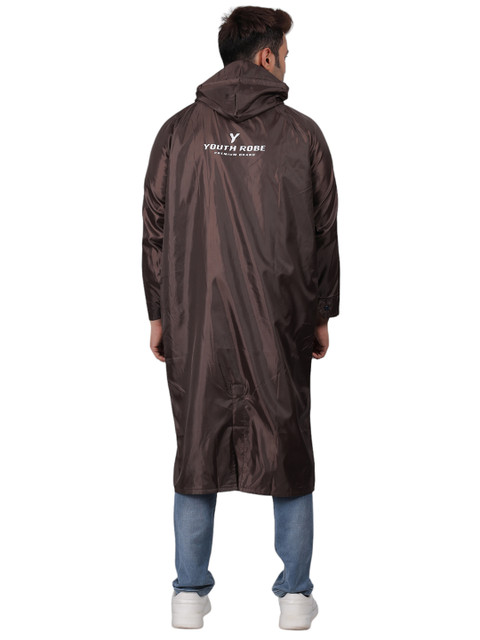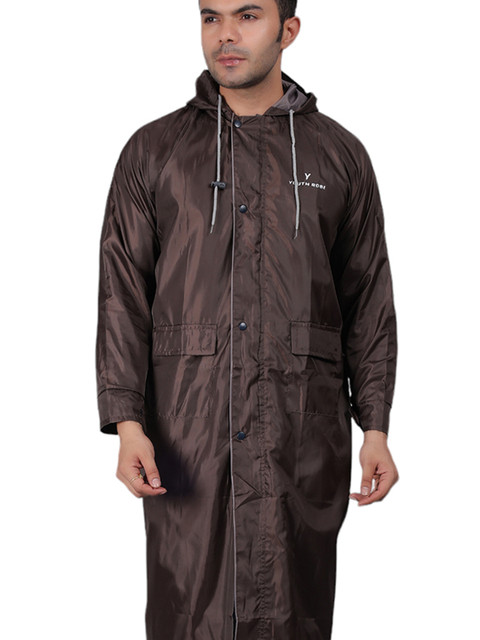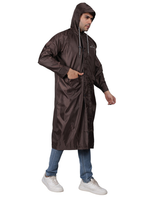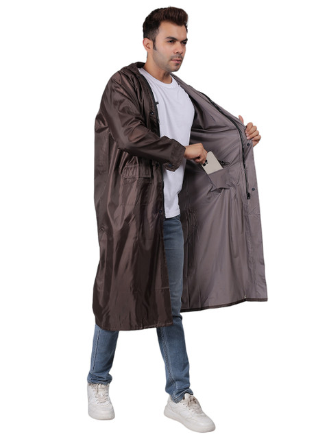 Brown solid regular-fit hooded rain jacket, has an attached hood with drawcord toggle, seam-sealed with adjustable hems, a full front zipper placket with flap, cuffs and hood with drawcord, a packable hood and breathable vents at the back, and two flap zipper pockets