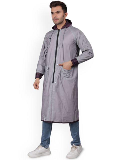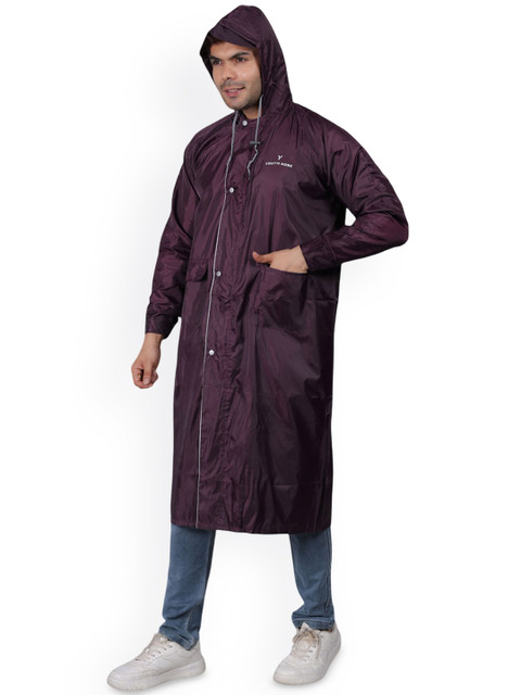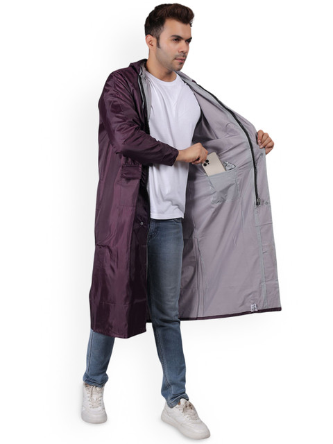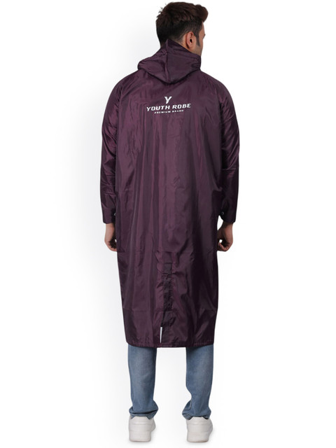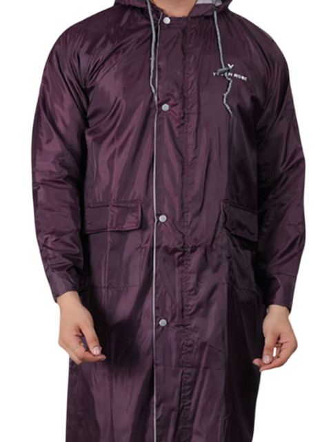 Purple solid regular-fit hooded rain jacket, has an attached hood with drawcord toggle, seam-sealed with adjustable hems, a full front zipper placket with flap, cuffs and hood with drawcord, a packable hood and breathable vents at the back, and two flap zipper pockets