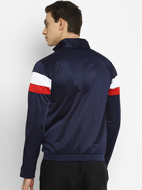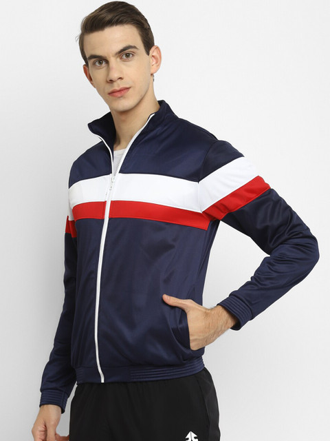 Navy blue colourblocked striped lightweight sporty jacket with zip detail, has a mandarin collar, 2 pockets ,has a zip closure, long sleeves, straight hemline, polyester lining