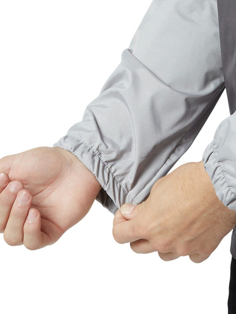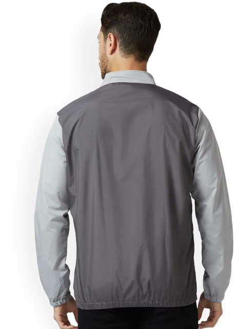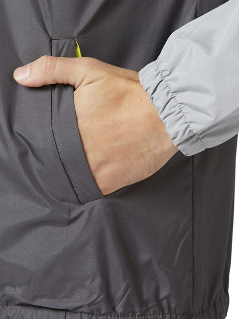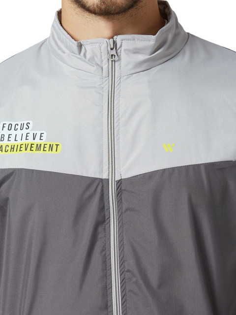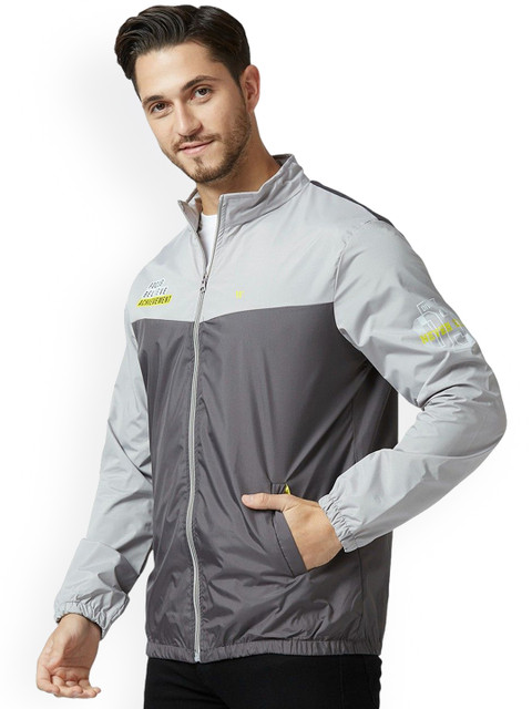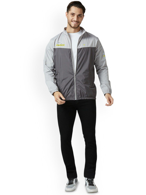 Grey colourblocked windcheater open front jacket with zip detail, has a mandarin collar, 2 pockets ,has a zip closure, long sleeves, straight hemline, polyester lining