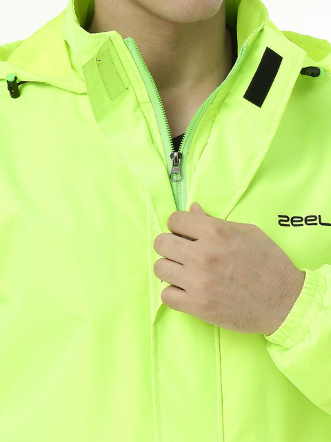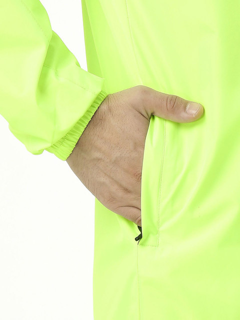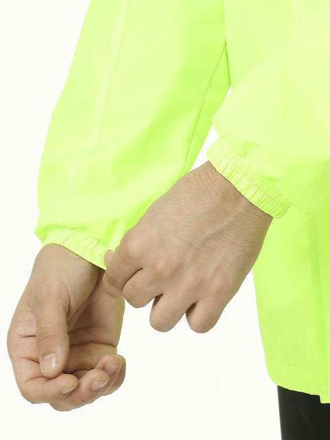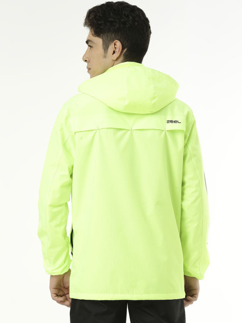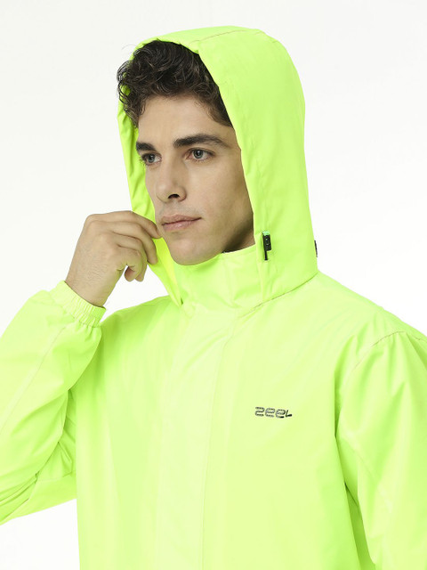 Neon Green rain jacket Has an attached hood with drawstring at the hood with stopper High neck Long zipper with flap over for extra protection and one pocket.