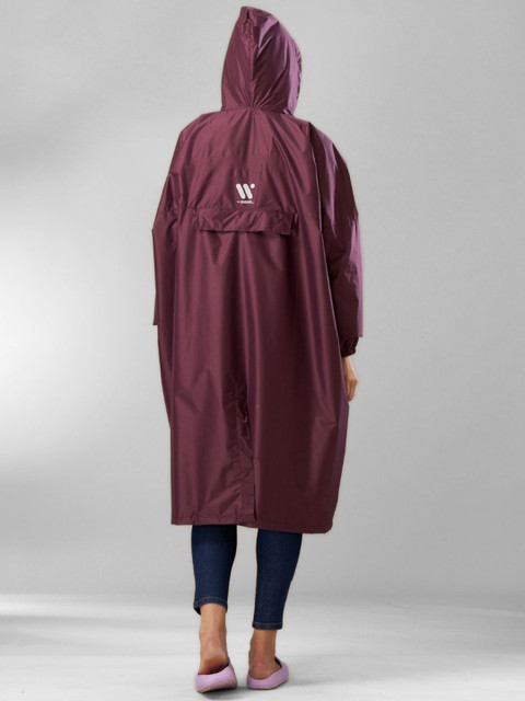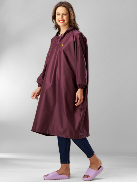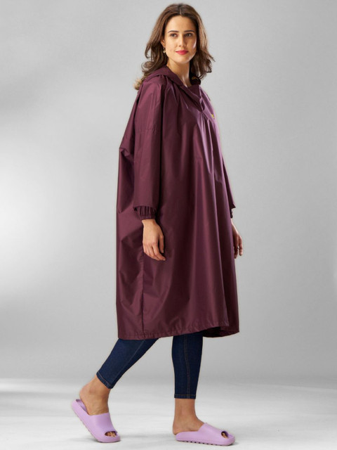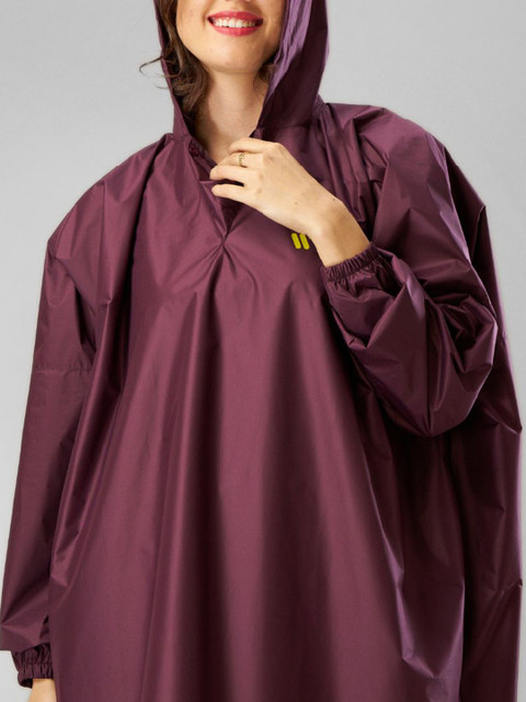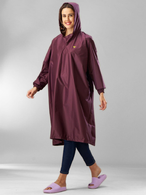 Purple solid waterproof rain jacket, has an attached hood, seam sealed with adjustable hems, long sleeves and slip-on closure
