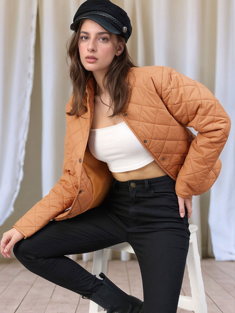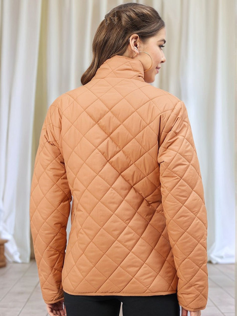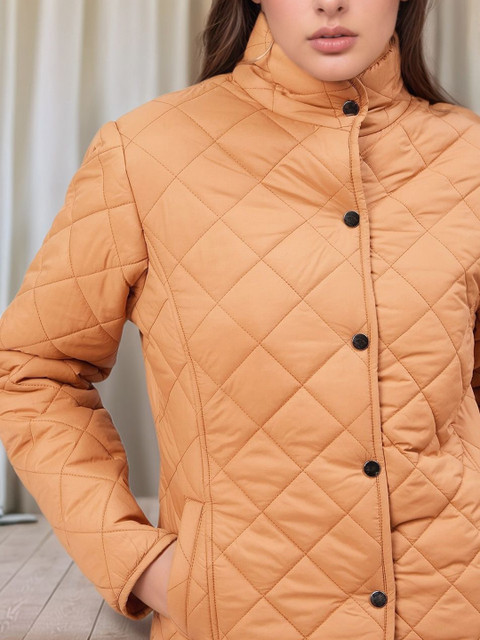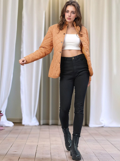 Tan solid lightweight padded jacket with rivets, has a stand collar, 2 pockets ,has a button closure, long sleeves, straight hemline, polyester lining