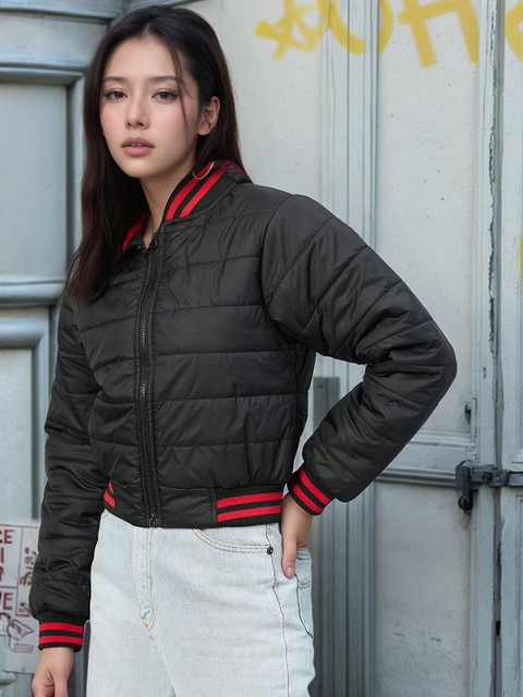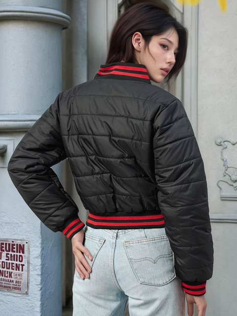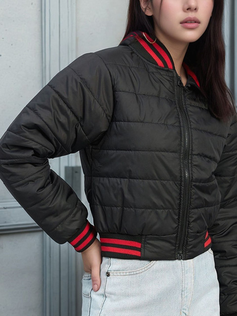 Black solid lightweight padded jacket with zip detail, has a mock collar, 2 pockets ,has a zip closure, long sleeves, straight hemline, polyester lining